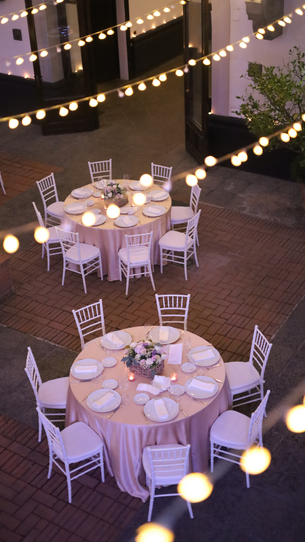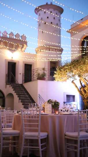 Allestimento serale nella corte: un'atmosfera suggestiva sotto le luci tra architettura storica e natura.
